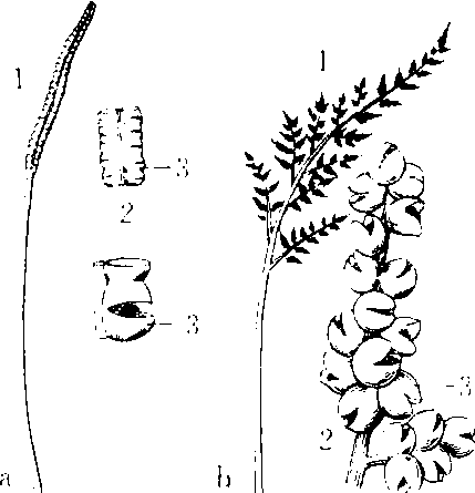 孢子囊穗 a.单生的孢子囊穗 b. 分枝的孢子囊穗 1.孢子囊穗 2.孢子囊穗的部分放大 3.孢子囊(已成熟开裂) |