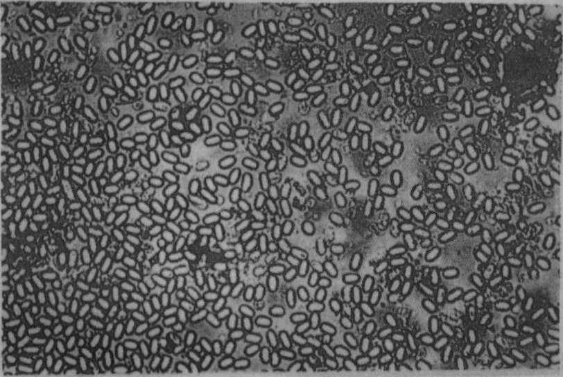 图1 蜜蜂微孢子虫的孢子 症状 孢子虫病的症状常与蜜蜂麻痹病、饥饿、杀虫剂中毒和下痢时的症状相似。蜜蜂患病初期,外部症状不明显,活动正常。患病后期,蜜蜂个体瘦小,两翅散开不相连,萎靡不振,螫刺反应丧失,少数病蜂腹部膨大。前胸背板和腹尖变黑,腹部1~3节背板深棕色,常被健康蜜蜂追咬,多爬在框梁、箱底板上或蜂箱前草地上,不久死亡。冬末和春季成蜂大量减少,往往伴随着蜂王的丧失或交替,这是蜂群感染孢子虫病的明显症状。染病的哺育蜂舌腺萎缩,饲喂幼虫的能力降低。