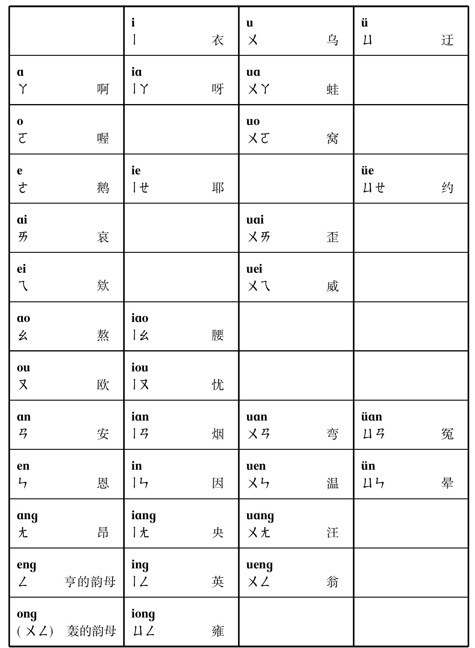 (4)i行的韵母,前面没有声母的时候,写成yi(衣)、yɑ(呀),ye(耶)、yɑo(腰)、you(忧)、yɑn(烟)、yin(因)、yɑnɡ(央)、yinɡ(英)、yonɡ(雍)。
