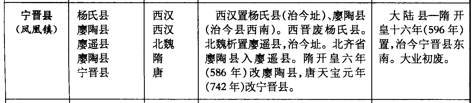 宁晋县(凤凰镇)杨氏县廮陶县廮遥县廮陶县宁晋县西汉西汉北魏隋唐西汉置杨氏县(治今址)、廮陶县(治今县西南)。西晋废杨氏县。北魏析置廮遥县,治今址。北齐省廮陶县入廮遥县。隋开皇六年(586年)改廮陶县,唐天宝元年(742年)改宁晋县。大陆县—隋开皇十六年(596年)置,治今宁晋县东南。大业初废。