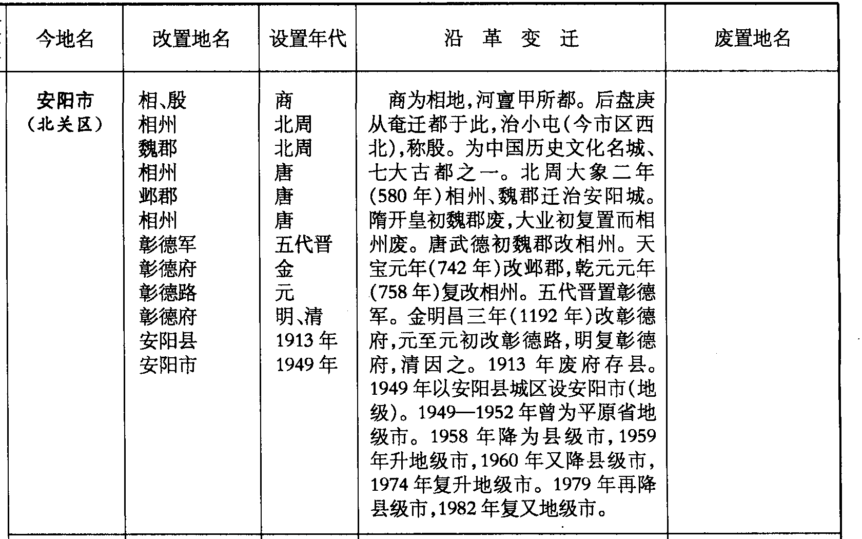 商为相地,河亶甲所都。后盘庚从奄迁都于此,治小屯(今市区西北),称殷。为中国历史文化名城、七大古都之一。北周大象二年(580年)相州、魏郡迁治安阳城。隋开皇初魏郡废,大业初复置而相州废。唐武德初魏郡改相州。天宝元年(742年)改邺郡,乾元元年(758年)复改相州。五代晋置彰德军。金明昌三年(1192年)改彰德府,元至元初改彰德路,明复彰德府,清因之。1913年废府存县。1949年以安阳县城区设安阳市(地级)。1949—1952年曾为平原省地级市。1958年降为县级市,1959年升地级市,1960年又降县级市,1974年复升地级市。1979年再降县级市,1982年复又地级市。