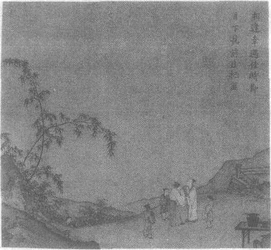 宋。绘者不详。绢本设色。纵25.3厘米,横27.5厘米。天津市艺术博物馆藏。此图描绘的是月夜下旧友会聚于山间的情形。图中远景阔远凝净,空中一轮明月高悬,月光洒满山间。图中近景的左侧是山麓缓坡,其上翠竹丛生,竿曲叶垂,给月夜增添了几分秀媚;近景右侧摆放几案,案上置酒炉,前边不远处有一柱栏围起的平台;近景中间绘两位惜别的旧友,在这姣好的月夜美景中会聚,相对而立,举杯恭贺,三稚童在旁边侍立;山坡下又一稚童正负琴拾级而上。此图风格近似马远,物象多沿画面底边安排,以突出月夜下天空的明净开阔,整幅画面充满了一种清新、惬意的氛围。此图右上方有楷书题诗:“相逢幸遇佳时节,月下花前且把杯。”