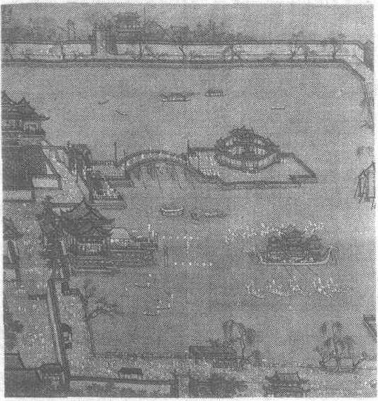 南宋。无款。绢本设色。纵28.5厘米,横28.6厘米。天津市艺术博物馆藏。此图绘北宋京城汴梁(今河南省开封市)金明池水戏争标的场面。北宋汴京风俗,每年3月1日,皇帝在城西金明池观水军演习和水上竞技表演。全图在纵横仅约一尺的画面内绘有金明池全景,周围苑墙围绕,池中筑十字平台,台上建圆形殿宇,有拱桥通向左岸,左岸建有彩楼、水殿。池岸四周间有凉亭、船坞。水中龙船高达数层,龙船两侧各有小龙舟5艘,每艘约10人并排划桨,船头一人持旗,进行指挥。苑墙内外,人群熙来攘往。图上人物数以千计,虽细小如蚁,而动态、神态却依稀可辨。宫殿、桥梁、龙舟、门墙皆用界画技法,细密工整,透视准确,比例匀称,是兼有艺术和历史价值的重要作品。在图左侧的粉墙上有楷书“张择端呈进”字样。经专家鉴定,此画与张择端另一名作《清明上河图》比较,无论风格、笔法差异甚多,很有可能是南宋人的摹本。