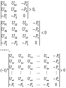 U1/P1= U2/P2= … =Un/Pn=λ 二阶条件是在最佳商品组合(x1*,x2*,…,xn*) 处各阶加边海塞行列式的符号是正负交错的: