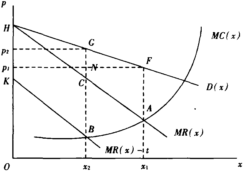 政府向卖方垄断者征收消费税对产品的垄断产量 (销售量)、垄断价格、消费者和垄断者以及社会福利所产生的后果。效应包括:(1)产品的垄断量减少,由x1减至x2;(2)垄断价格上升,由p1升至p2;(3)卖方垄断者承担全部税金,等于HKBC的面积,或等于tx2;(4)消费者剩余减少,等于p2p1FG的面积;(5)生产者剩余减少,等于ABC面积与税金之和;(6)社会福利受损失等于减少的生产者剩余之和减去税金,即GFAB的面积。从价税与从量税(如图)的结果类似。