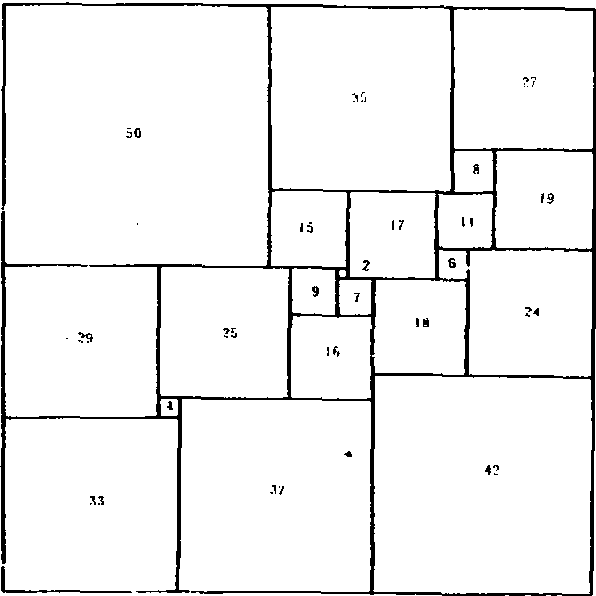 利用电子计算机已经证明: 不存在20阶或20阶以下的完美正方形。1978年,荷兰数学家A. J. W.杜伊杰斯廷(Duijvestijn)发现了21阶的完美正方形,边长为112,如图 (图中数字为小正方形边长)。更加奇妙的是,它还是一个简单完美正方形,即其中的小正方形不构成任何矩形。杜伊杰斯廷的发现很可能是独一无二的,也就是说,很可能再也没有与此不同的21阶完美正方形了。