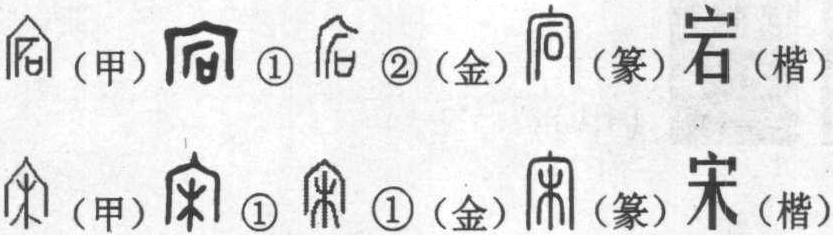 宕,音荡。甲骨文的 “宕”,从 “宀” (音绵),从“ ”(甲骨文石字的最先形体),从“口”,为会意字。“宀”, 居所的代形符号, “ ”, 甲骨文石字, 其形有两种标意:一是石刀工具之形,古人以其尖刃部位权作剥削砍砸之用。二是石崖之形,在这里用作石崖,石崖下有“口”即为自然形成的山洞。全字提供给我们的信息是:人在自然形成有口的山洞里居住。在远古时代的人类幼年,刚从地平线上爬起来,没有太多改造自然的能力,不会为自己营造居所,天然洞穴只能是他们的栖身场所,过着与兽无异的群居生活。考古发现的北京周口店“山顶洞人”就是这样一个处境。广西是早期人类活动和生活的重要地区,这里发现的早期人类活动踪迹还有 “白莲洞人”; 来宾麒麟山盖头洞发现的一个人头骨化石;柳江通天岩山洞中发现一个人头骨化石和四个胸椎骨;马鞍山附近的三个洞穴中发现三个人头骨碎片和一些牙齿、股骨和髋骨等;荔浦苏村岩东洞发现一颗小孩臼齿;在北地苏乡九𣸤山溶洞中发现四颗人牙化石和柳州市东南部都乐岩蘑菇洞发现的人的臼齿和一段臼齿化石。另外,在云南西畴孤峰仙人洞发现五颗人牙齿;在山东乌珠台溶洞、贵州兴义猫猫山岩洞、浙江建江乌龟洞、河南安阳小南海石灰岩洞等发现的人骨化石和动物化石。这些都足以证明人类早期宕居的史实。 《说文》: “宕,过也。一曰洞屋。从宀,砀省声。”许慎虽然析形有误,但“洞屋”之释还是正确的。然而,“过也”之解的“过”(過)却使人难于理会,疑是“蜗”或 “迵”(音洞,有通透之意)字之讹误。 位于甘肃省陇东平凉,有一名山曰“崆峒”,那里有人类早期宕居的遗迹。山上有个雷声峰,当打雷时布滿山间的空洞,就使得雷声此起彼伏,连绵不绝而得名。崆峒山周围聚居的部落为空同氏。传说黄帝曾来此山问道于空同人广成子。据说殷商族也是空同民族的一支。崆峒人的窑居洞处,是黄土高原长期以来人文景观的一大特色。 文字是记录语言的符号系统,是对历史的写真与追记。“宕” 当然不是与宕居同时产生,那个时候人类是否有了系统的语言也很难说。宕居是人类最先利用自然山洞栖息的一种形式,后来随着改造自然能力的不断提高,才出现了诸如巢居、穴居、复居、良居、窑居、宋居、层居等居住形式。大概由于宕居已远离人类,生疏、淡漠与忘却的发生就成了很自然的事,故殷卜用作地名,宕在今河北省曲城县西,当时是商王的猎场,卜辞有“田于宕”。没有 “宕” 对人类早期的这一居处形式的追记与锁定,如今有谁还能知道我们祖先的那一段艰难困苦的历程呢? 金文❶的“宕”从宀,从石,可会意为石屋。金文 ❷的 “宕”从广(音衍,意同庵),从石,可会意为在石洞前接续一节草庵。小篆、楷书从宀,从石,一脉相承。 宕的本意是人类早期栖身的石屋。宕居时代是人类的幼年,处于蒙昧野蛮状态,个人行为惟一是维持和延续生命,因此宕有: (1)流动之意,晋皇甫谧《三都赋序》: “雷同影附,流宕忘反,非一时也。” 宕子即在外流浪的游子,三国曹植《怨歌行》: “借问叹者谁,自云宕子妻。” (2)放纵不羁之意。 (3)宕,久居滞留,故有拖延、延缓之意。 (4)宕居地面、洞壁凸凹不平,故宕有起伏不平之意。宕的宕居之本意早被历史的尘沙湮没,今人多用其引申之意。 宋,甲骨文、金文、小篆、楷书一脉相承,从宀从木,木在宀下,为会意字。甲骨文 “宀” 的外观是圆锥形房子的切面图,中间由一根木柱撑起,周围辐射型的椽木斜担于圆周形围墙之上,上边由草或草泥苫盖。或也是现今农村鞍间房子的侧视白描,顶端是马鞍形的房脊,向外延伸的是前后两面坡及其房檐,两边向下垂直的是前后檐墙。“木” 为一根顶梁的柱子。“宋”,送走了人类长期无见天日的穴居洞处,这是人类从地穴爬出以后在地平线以上所创造的奇迹。《说文》: “宋,居也。从宀,从木。” 宋居这种形制的建筑,早在六千年以前的西安半坡母系族落遗址就有发掘:一座房子由十二根已有分工的木柱支撑,列为整齐三排,每排四根,中四根高,形成“人” 字形两面坡,脊檩已达两山。顶部密布木椽,以茅草、草泥涂之。那个时候似乎尚未出现版筑技术,四面墙壁是用扎排木桩涂泥弥缝构成的。从结构看已经形成 “墙倒房不塌” 的牢固格局,并具有 “前堂后室”、“一明两暗” 的雏形。华夏民族后起的延续几千年的一木顶大厦的建筑风格大概就从这里肇始的。 “宋”的原本之意是人创造的一种建在地面比较先进的一种居室。宋音通耸,宋的寓意是高耸的房屋建筑,是屹立东方地平线上的宏伟工程,是宕、巢之居,穴、复之居与之相比而不能同日而语的伟大形象。因此,“宋”又成了一个相当惹眼与抢手的字,向来被王者所青睐。中国的方块汉字字形引发和体现了中华民族的形象思维与中华传统思维方式及其生命力的存在。人们赋予“宋”这一 “木” 上支撑 “宝盖”、方方正正、上下协调、端庄肃穆形体的人文含意要比它的原本意义宽阔得多。殷商时代,宋被一个小方国定为国名,但给国人没有带来多少好处,商王常常去那里围猎、作军事演习,辎重扰民,民不堪负。周武王灭商后封商纣之子武庚于宋地(今河南商丘),但武庚妄想以 “宋” 为依托东山再起,再撑一个殷商王朝,发动武装叛乱,被周公所杀。南朝刘裕代晋称帝,树国号为宋