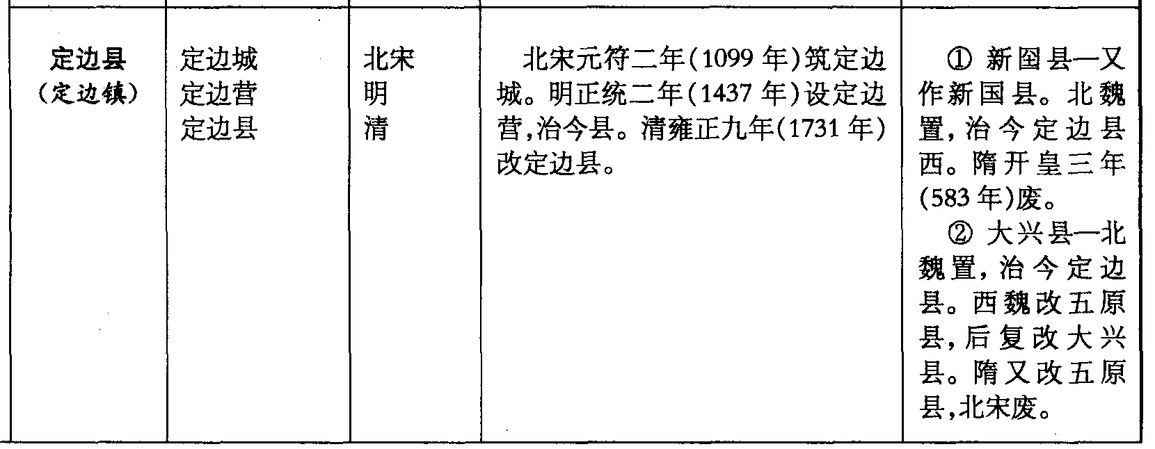 定边县(定边镇)定边城定边营定边县北宋明清北宋元符二年(1099年)筑定边城。明正统二年(1437年)设定边营,治今县。清雍正九年(1731年)改定边县。❶ 新囶县—又作新国县。北魏置,治今定边县西。隋开皇三年(583年)废。❷ 大兴县—北魏置,治今定边县。西魏改五原县,后复改大兴县。隋又改五原县,北宋废。