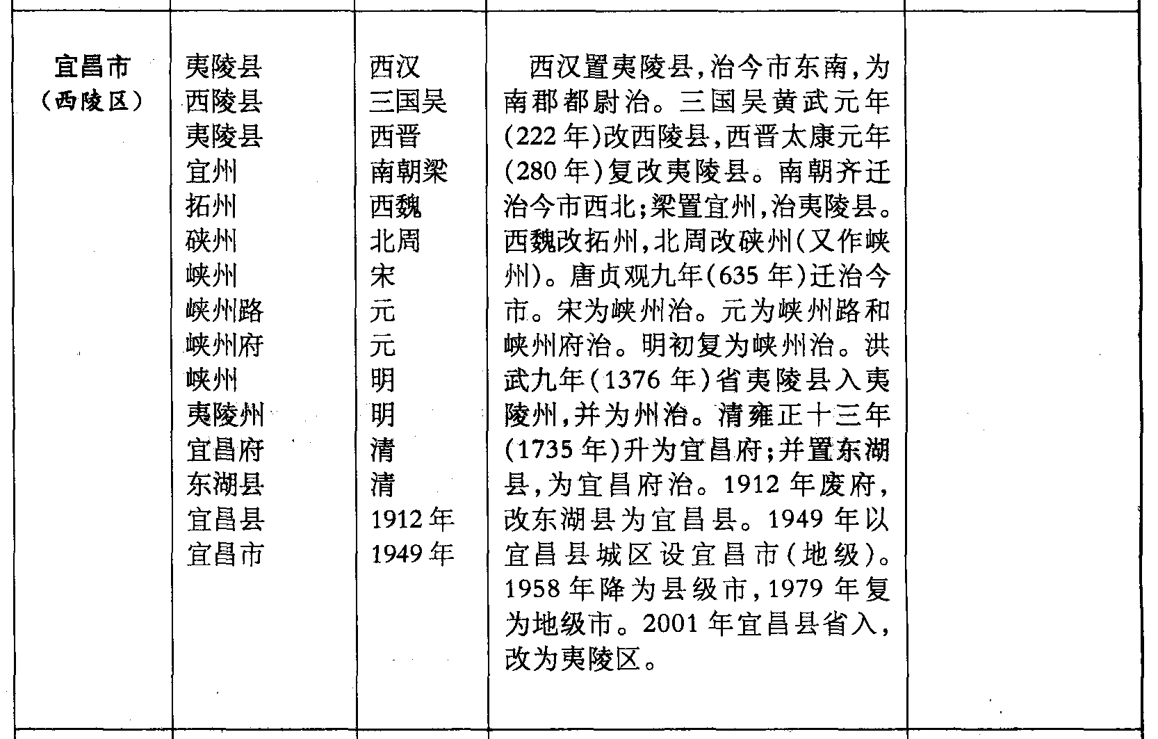 西汉置夷陵县,治今市东南,为南郡都尉治。三国吴黄武元年(222年)改西陵县,西晋太康元年(280年)复改夷陵县。南朝齐迁治今市西北;梁置宜州,治夷陵县。西魏改拓州,北周改硖州(又作峡州)。唐贞观九年(635年)迁治今市。宋为峡州治。元为峡州路和峡州府治。明初复为峡州治。洪武九年(1376年)省夷陵县入夷陵州,并为州治。清雍正十三年(1735年)升为宜昌府;并置东湖县,为宜昌府治。1912年废府,改东湖县为宜昌县。1949年以宜昌县城区设宜昌市(地级)。1958年降为县级市,1979年复为地级市。2001年宜昌县省入,改为夷陵区。