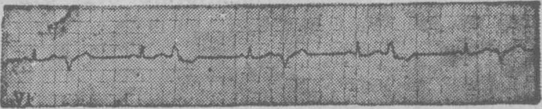 图1 频发室性过早搏动呈二联律 图示每一窦性心搏后有一提前出现的宽大畸形的QRS波群,为室性早搏,呈二联律。早搏逆传至心房,表现为QRS波群后的逆行P′波。室性早搏后有完全代偿间歇。