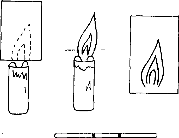 点燃一支蜡烛,待火焰平稳后,迅速将一张硬纸片垂直火焰迅速插下后约1秒钟抽出,便可获得一张火焰不同温度的纵剖面图,或用火柴梗从焰心通过火焰,可得到火焰的横断面图。从燃焦部位颜色深浅的不同,便可知道火焰的分层以及与温度高低的关系(见下图)。
