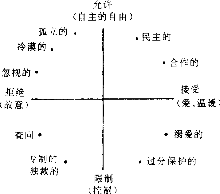 即家庭教养方式的类型。指父母及其代理人教养子女的行为模式。家长在教养方式上有两个重要的行为维度:一是关爱维度,代表家长对子女的关心爱护程度(见图4.1-2中的横座标,两端分别以接受——拒绝表示);二是控制维度,表明家长对子女行为的干预程度(见图4.1-2中的纵座标,两端以允许——限制表示)。这两个维度以不同方式相结合便构成种种不同的教养模式。比如,对子女既爱又给予一定自主权的父母可称为民主的;爱子女却过多控制其行为的父母可称为过保护的;对子女干预很多而缺乏爱心的父母是专制式的;对子女行为不加干预而且也缺乏爱心的父母是冷漠式的等等。关爱维度对子女的影响很大,因为它是父母教育孩子以及子女接受教育的良好感情基础,只有在爱和关怀这一温馨的感情背景下才更有利于父母将教育期望传递给子女,也才更有利于子女将父母的教育期望转化为自己自觉的行为目标。在父母极端拒绝子女(不爱甚至怀有敌意)的家庭,子女的行为容易出轨。控制维度对儿童的影响较为复杂,既要受父母所采用的控制方式(强制还是引导)的影响,又要依赖于亲子之间的感情基础。但不管怎样,家庭教养方式对子女发展,尤其是其个性的发展有着直接的影响作用。