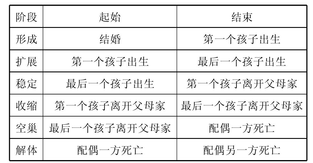 | 释义 | 家庭生命周期 家庭生命周期这是由美国社会学家提出的用于分析家庭结构、性质与行为之间关系的概念。在社会学家看来,家庭如同人体一样也表现为一个有规律地变化着的生命循环过程,这种过程可以分为以下一些阶段:结婚组成家庭、生子、养育儿女、子女入学、子女结婚、与父母分居,以父母的去世为暂时的结束。在生命周期的每一阶段,家庭成员之间的权利与义务是不相同的。各阶段的持续时间以及各阶段上不同的家庭结构、成员关系、经济状况、社会活动等特点,可用作解释家庭中的行为状态及其变化的变量。 ☚ 家庭互动定律 娇纵爱 ☛ 家庭生命周期 家庭生命周期指一个家庭从其建立(结婚)起经过运动、变化,直到其消亡的全过程。象人有自己的一生一样,家庭也有它的一生,在其一生的不同时期,有着不同的特点,而家庭的每一时期的不同特点都直接关系着家庭结构和家庭内部的关系。家庭生命周期的划分方法有多种,国外社会学家一般将其分为六个阶段: ☚ 家庭的变迁 家谱 ☛ 家庭生命周期由夫妻结合建立家庭开始至双方死亡而结束的家庭生活全过程。家庭生命周期与婚姻关系相始终,可分为婚后无孩、生育、子女结婚离家、后期父母和鳏寡等阶段;受婚姻模式、生育模式、生活方式、人口寿命等因素的影响。 家庭生命周期 家庭生命周期一定生产方式下,在某类社会环境中,从男女结合组成家庭开始到夫妻双方都死亡而告终的整个家庭生活过程。从一个核心家庭的产生、发展至衰亡所经历的全部时间是典型的家庭生命周期。家庭生命周期可以划分为若干阶段,只是目前尚无统一的划定标准,一般都大体上把它划分为如下六个阶段。 ☚ 长老社会 父系家庭与老人地位 ☛ 家庭生命周期 家庭生命周期指家庭从产生到消亡的全过程。以结婚和夫妻双亡为家庭产生和消亡的标志。一般分为无孩期、生育期、中间期、离巢期、后期五个阶段。无孩期从结婚到第一个子女出生;生育期从第一个子女出生到最后一个子女出生; 中间期从最后一个子女出生到第一个子女结婚; 离巢期从第一个子女结婚到最后一个子女结婚; 后期从最后一个子女结婚到夫妻双亡。不同的家庭,家庭后期的具体形态不一样,有的父母与已婚子女生活在一起,组成扩大家庭,有的与已婚子女完全分居,成为空巢家庭。在家庭发展的不同阶段,家庭面临的主要问题是不同的,因此,夫妻双方必须不断地调整自己的行为,掌握新的生活技能以适应家庭生命周期的变化。家庭生命周期受初婚年龄、初育年龄、生育率、家庭结构、人口寿命等因素的影响。 ☚ 家庭结构 代沟 ☛ 家庭生命周期Family Life Cycle一个家庭从形成、发展到消亡的全过程。美国学者P.C.格里克于1947年从人口学角度首先提出比较完整的家庭生命周期概念。一般把家庭生命周期划分为形成、扩展、稳定、收缩、空巢与解体六个阶段。标志每一阶段的起始与结束的人口事件如下表所示。六个阶段的起始与结束,一般以相应人口事件发生时丈夫(或妻子)的均值年龄或中值年龄来表示,各段的时间长度为结束与起始均值或中值年龄之差。例如,如果一批妇女的最后一个孩子离家时(空巢阶段的起始),平均年龄为55岁,而她们的丈夫死亡时(空巢阶段的结束),平均年龄为65岁,那么这批妇女的空巢阶段为10年。经济学家恩格尔等人将家庭生命周期分为单身期、新婚期、满巢期1(年轻夫妇,最小的孩子不满六岁)、满巢期2(年轻夫妇,最小的孩子六岁以上)、满巢期3(年老夫妇和孩子)、空巢期1(年老夫妇,没有孩子在身边,户主仍在工作)、空巢期2(老年夫妇,没有孩子在身边,户主退休)、丧偶独居期等阶段。判断家庭生命周期阶段的常用变量有婚姻状况、生育状况、在家的子女人数、在家的子女年龄、家庭成员的工作状况等。随着时间的推移,这些变量的变化将导致家庭组成的变化,因而改变家庭的需要、家庭的购买和消费决策过程,使家庭消费呈现出显著的阶段性特征。