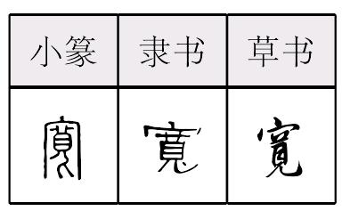 【提示】艹,3画,宋体是一横两竖,楷体第三笔是撇;旧字形4画, 作 。 *宽(寬)kuān10画 宀部 (1) 横的距离大,范围广: ~广|~阔|~敞|~泛。 (2) 宽度: 这条河~一里。 (3) 放宽;使松缓: ~限|~心|~解|~慰。 (4) 宽大: ~容|~待|~让|~恕。 (5) 富裕: ~余|~裕。 宽寬kuān战国以来的形声字。从宀(mián,房屋形),苋(莧,是羱的本字。字从羊角,目表示头,儿加一点表示足。比羊大,像羊,犄角细长)声。苋又读wán或huán。声母演变如莞(wǎn)又读guǎn,歡(huān)觀(guān)都从雚(guàn)。本指房屋宽敞。规范字从见(見)旁类推,省去一点。引申为阔大。如:马路很宽。转为动词,放宽,使松缓。如:宽心。略引申如:宽限|从宽。组词如:宽容。现代又指物体横的方面的距离,在长方形中多指较短的一边。如:长方形的面积是长乘宽。 宽寬★繁◎常★常
