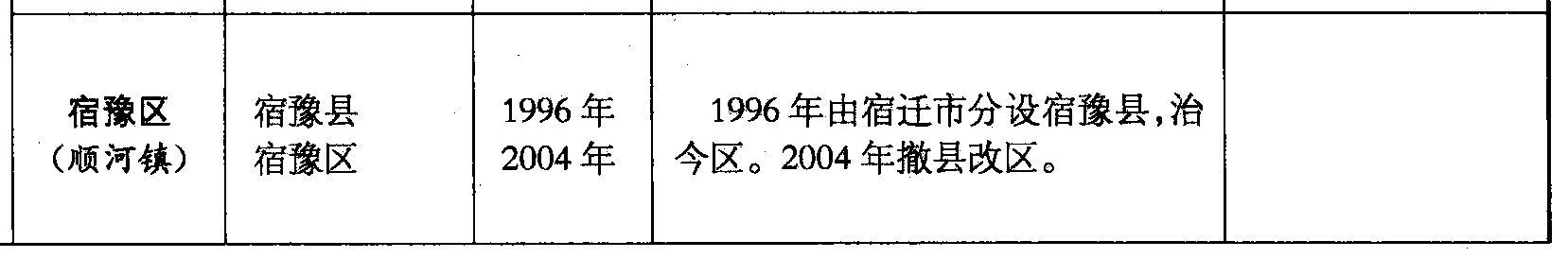 宿豫区(顺河镇)宿豫县宿豫区1996年2004年1996年由宿迁市分设宿豫县,治今区。2004年撤县改区。
