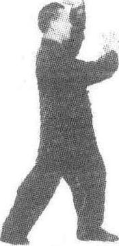 武式太极拳式。左腿在前,蹬右脚呈左前弓步; 左手随之上抬,右掌向前推出。如图。