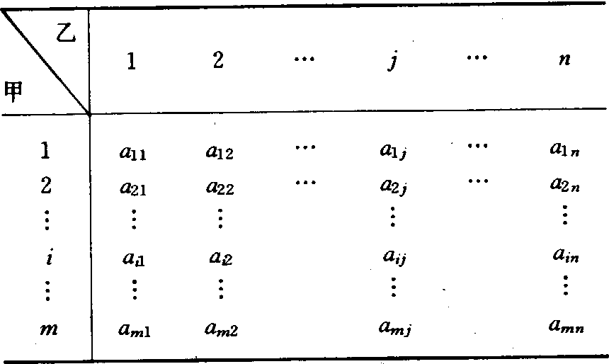 注:*表示甲、乙双方对策方案。 在本例中甲如果选a1,最少能赢得200元,如选a2,最少能赢得100元。按小、中取大准则选a1,至少赢得200元。对于乙方,他希望损失最小,因此乙如选b1最多付出200元,如选b2,最多付出300元。按大中取小准则选方案b1,至多付出200元。最终结果是甲选a1,乙选b1,对策解为200元。此值恰等于行最小值中的最大值和列最大值中的最小值,称为鞍点。这种对应于鞍点的策略,称为最优纯策略。 ❷混合策略解。如果在二人零和对策中找不到一个双方都满意的可重复采用的策略,就成为无鞍点的二人零和对策,此时必须采用混合策略求解,即在重复对策时各方必须交替采用不同方案。例如,甲、乙两公司在推销产品的活动中,甲公司采取a1和a2两种方案,乙公司采取b1和b2两种方案,构成赢得矩阵。矩阵中的赢得值表示市场占有率(%)。正值表示甲赢得而乙失去的值,负值表示甲失去而乙赢得的值。假定用悲观准则求解,如表3,结果是甲选a1,乙选b2。没有鞍点。这种情况下双方不能重复采用一种方案,而必须采取混合策略。例如,甲先选a1,乙将选b2。当甲发现乙选b2时,甲将转向a2,这样甲将获得比a1大的赢得值。当乙发现甲转向a2,必然转而选b1,于是甲又将转向a1,等等,双方将会发现,改变方案比总是采用一种方案要好。平均赢得值由双方采用各方案的次数比例决定,而且在某一比例时对各方都是最好的。本例的最终结果:甲公司选a1、a2的次数比为3:5;乙公司选b1、b2的次数比为1:3,甲的期望赢得值为1/4,乙的期望失去值也为1/4。局中人数m=2和方案数n=2的混合策略对策问题可用解析法或图解法求解,m≥2, n≥2的有限对策问题,可用线性规划法求解。 表3 混合策略对策问题