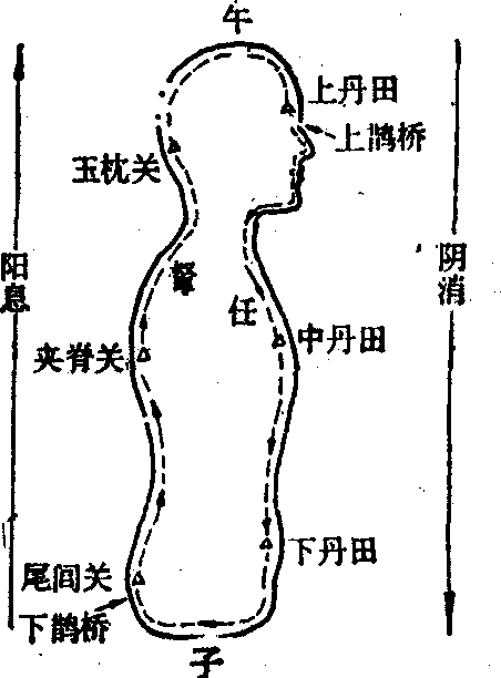 | 释义 | 小周天太极拳内功练习理论。基本原理是通过意念引导内气在任、督二脉中循行,来带动全身内气的周流,提高内气质量。其循行的主要关窍有: 丹田、会阴、尾闾、命门、夹脊、玉枕、百会、膻中等。 小周天 小周天见“周天运转”。 ☚ 大周天 周天运转 ☛ 小周天气功功法。全称阴阳循环一小周天。秦仲三《气功疗法和保健》载其功法为:呼气时,舌抵上腭,鼓腹使气下降到脐下,称气贯丹田。再吸气,收腹,足趾抓地,舌抵上腭,从会阴运气过肛门,沿督脉的尾闾,夹脊和玉枕三关,到头顶百会穴。再由两耳颊分道而下,会至舌尖,与任脉接。气沿此道可循环往复。 小周天 小周天内丹学术语。亦称“周天搬运”、“子午周天”等。内丹功法的第一阶段,即炼精化气的过程。本阶段共分调药、产药、采药、封炉、炼药、止火六个步骤进行。通过意守丹田、凝神入气穴和调整呼吸,使下丹田精气旺盛,产生小药;再运用火逼念行、进阳火、退阴符以及沐浴等法,使精气从下丹田沿督脉上升,通过尾闾、夹脊、玉枕三关;再沿任脉下降,经过上、中、下三丹田,作周天运转,从而达到取坎填离、心肾相交、水火既济的目的。本功法是内丹术的基础功法,全过程约需百日左右。练成后可防病祛病,健身强体。 ☚ 炼神还虚 大周天 ☛ 小周天 小周天小周天,是古代气功主要流派之一的内丹术功法中的第一阶段,练精化气的过程。也称“百日筑基”。内丹术认为: 人到成年,由于物欲耗损,先天之精气不足,必须用先天元气温煦它,使之充实起来,并使之重返先天精气,这就是小周天练精化气过程的目的。完成这步功法,就可防病祛病。内丹术的特点,是要求内气在身体内按经络路线,循环周转,早期曾称为“金液还丹”(宋翁葆光《悟真篇注序》),也曾称为“河车搬运”(明·陆潜虚《玄肤论》)。以后就借用了天文学上这个“周天”的术语(明·伍守阳《天仙正理》)。也有把运转的路线,称为“天经”(元·俞玉吾《席上腐谈》)的。这种内气运转中的小周天过 程是指内气从下丹田开始,逆督脉而上,沿任脉而下,经历尾闾、夹脊、玉枕三关,上、中、下三丹田和上下鹊桥作周流运转。因此内丹术中特别重视任督两脉,正如明·李时珍在《奇经八脉考》中指出的“任督两脉,人身之子、午也。乃丹家阳火阴符升降之道,坎离水火交媾之乡。”小周天又称“子午周天”,或“取坎填离”、“坎离交媾”、“水火既济”、“心肾相交”等。这是因为内丹术中以十二地支中的子午代表天体的日月,人体的心肾,卦象中的坎离,方位中的南北(元·萧廷之《金丹大成集》)。上说可以用后天八卦图表示 (图见“八卦学说”条)。因为小周天就是要求后天返还先天,内丹术理论就用后天八卦图进指导,所以着眼点坎、离两卦上,而坎、离两卦在后天卦图中处于子、午的地位,因此有了以上多种名称。进行小周天功法的锻炼,内气感觉在督任脉上流走,开始于活子时,活子时之机,下丹田气动,产生小药,又称真种子,而后开始督任两脉的流转,并正确地掌握进阳火(阳息)、退阴符(阴消)、沐浴等要求。