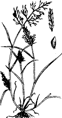 小画眉草low lovegrassEra-grostis poaeoides Beauv.,又称蚊蚊草、星星草、香莠草。禾本科,画眉草属(知风草属)。一年生草本。疏丛型禾草。广布于世界温暖地带,中国遍布各地。茎直立或斜上,细弱,高10~30 cm。叶片扁平;叶鞘脉上具腺点,鞘口有长柔毛。圆锥花序,小穗含4至多数小花。颖果球形。多生长于荒野草地、田边、路旁和撩荒地。在荒漠草原与荒漠带草原上,常与三芒草等构成夏雨型一年生禾草层片。叶多柔嫩,适口性好,羊、牛、马均喜食;夏、秋季骆驼也乐食,而冬、春季一般不食。