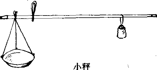 可以有两种做法:第一,取一根小学生用的横尺,在中间系一根提绳,两端各夹一个夹子。玩时可让幼儿手提小秤,在两边夹子上分别夹上瓶盖、硬纸、塑料袋、薄纸片等重量不大的物件。这是一种简易的小秤,可以使幼儿体验到不同质料的物体,重量不同。第二种小秤的制作,就是仿制农贸市场上常见的戥秤(如图),但不要求非常标准,在一根小直棍上,刻上几个刻度数,在靠近一端的地方固定一根提绳,提绳外端用绳子拴一个小盘或瓶盖,提绳另一侧用绳子拴一把废锁或小沙袋,就做成了小秤。玩这种小秤,不仅可使幼儿了解重量知识,还能了解平衡的知识。