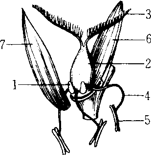 禾本科植物的小花 1.桨片 2. 子房 3.柱头 4. 花丝 5. 花药 6. 内稃 7. 外稃 |