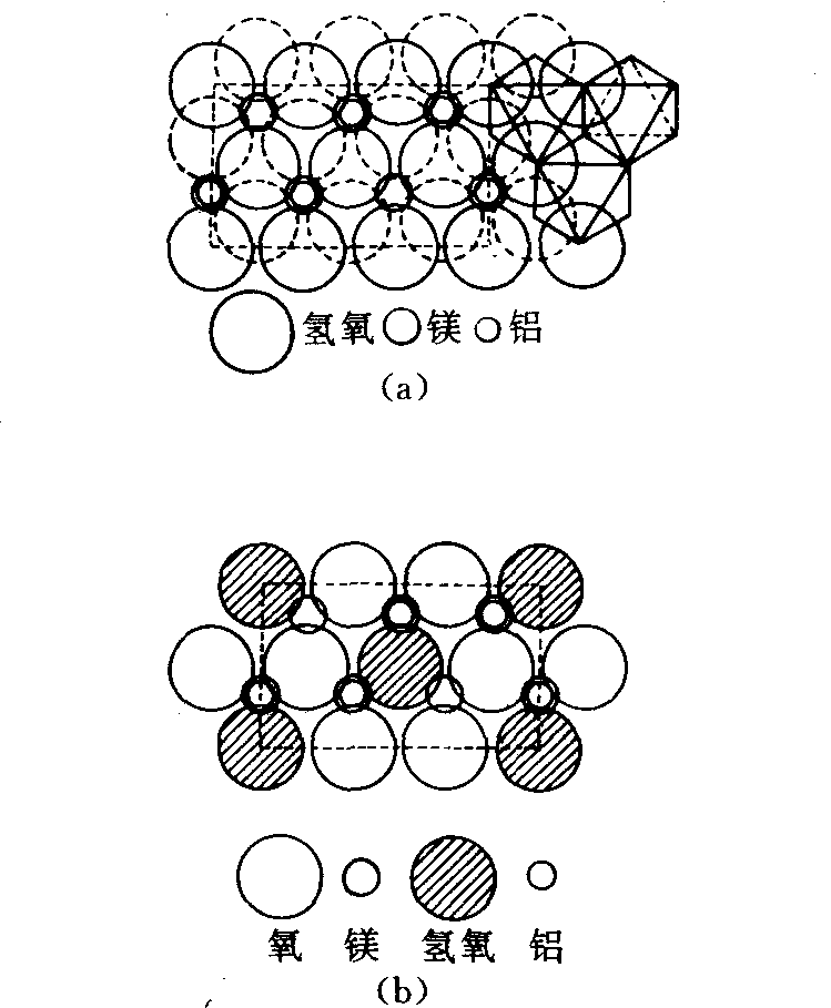 层状硅酸盐按单元层内四面体片与八面体片的比例分为2:1和1:1两种层型。滑石属2:1型(图3),上下两片四面体片上的顶端氧都朝向中间,充当Mg2+的配位阴离子。可是,每6个顶端氧的中心都留着一个空缺,需要由1个OH-来补足Mg2+的配位数。2:1型单元层的上下两面都有四面体底面氧组成的六方网孔,(OH)-就正对着这些孔。