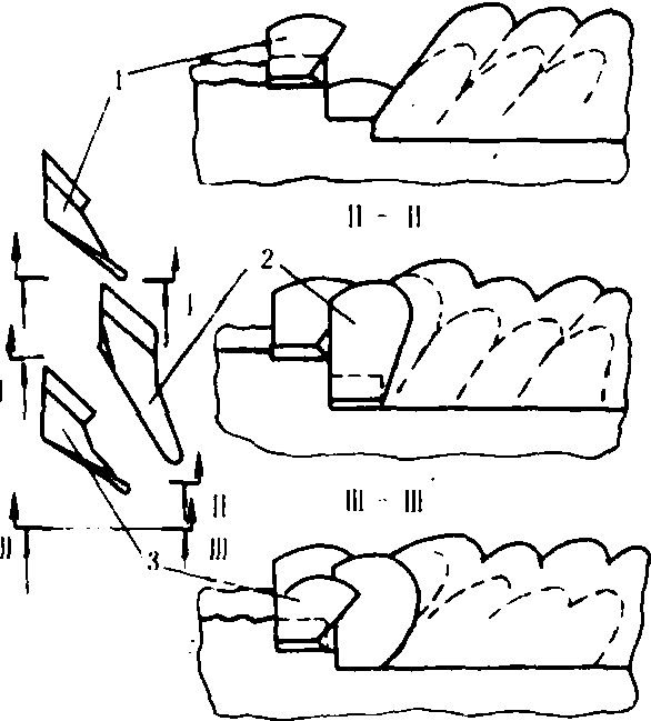 分三层耕作程序图 层耕犁也可由普通铧式犁体后加一个深松铲构成。采用“上翻下松”的分层耕作方式,将犁沟底部的坚实土层耕松,但不使之翻到上面来,不乱土层。还有一种层耕犁是将普通铧式犁体的犁壁下部去掉一部分,形成缺口犁体,实现上翻下松的分层耕作。 |