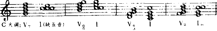 );以五音为低音构成的属七和弦为第二转位,名称为“属三四和弦”(Ⅴ