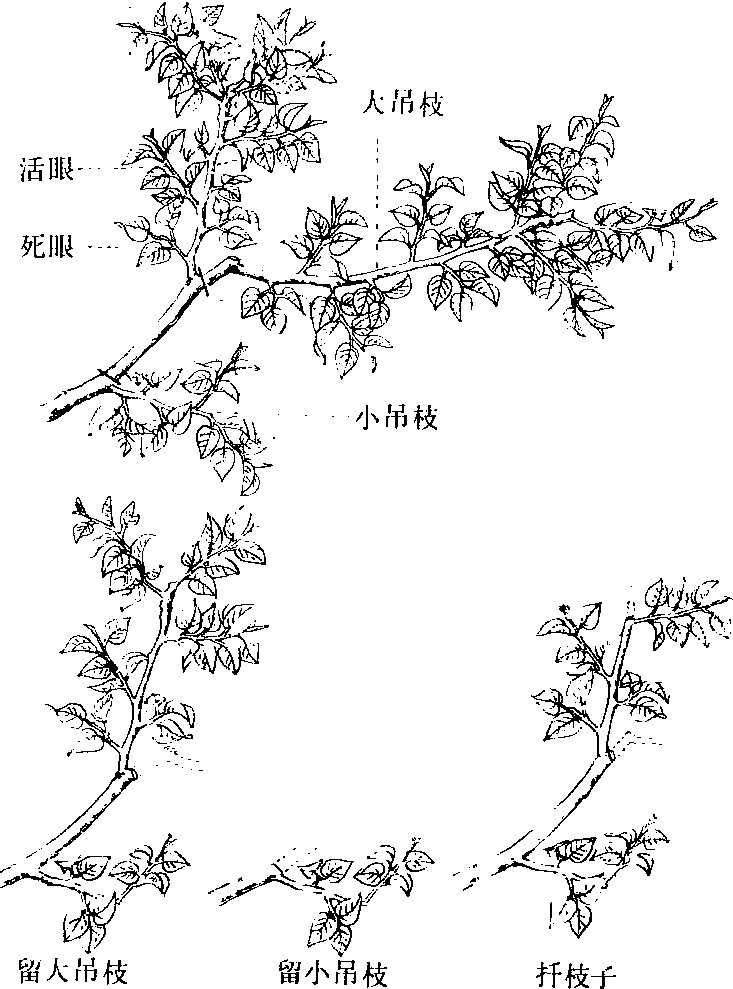 上述3种方法,应根据具体情况,灵活运用。一般栽后10年内的桑树,除留大吊枝以养成中心树干外,还应多留扦枝子以养成支干,树冠内空虚处,应留小吊枝进行补充。栽后10~20年的桑树,要使树冠继续扩大,又要防止树冠过大空虚。栽后20年的桑树,一般树冠已经定型,应多用扦枝子和留小吊枝等办法,保持基本树型获得年年丰收。 |