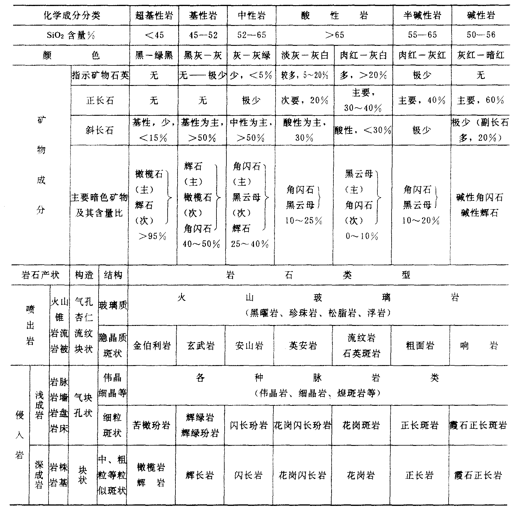 | 释义 | 岩浆岩的分类 岩浆岩的分类yanjiangyan de fenlei自然界中的岩浆岩多种多样,目前已被命名的就有一千多种。它们在矿物成分、结构、构造、产状及成因等方面各有异同,但它们都是地球演化和岩浆活动的产物。为了更好地认识各类岩浆岩之间的内在关系和变化规律,为便于了解其成因、性质和实际应用,对众多的岩浆岩进行系统的科学分类是十分必要的。对岩浆岩进行分类的主要依据是: 主要岩浆岩分类鉴定表