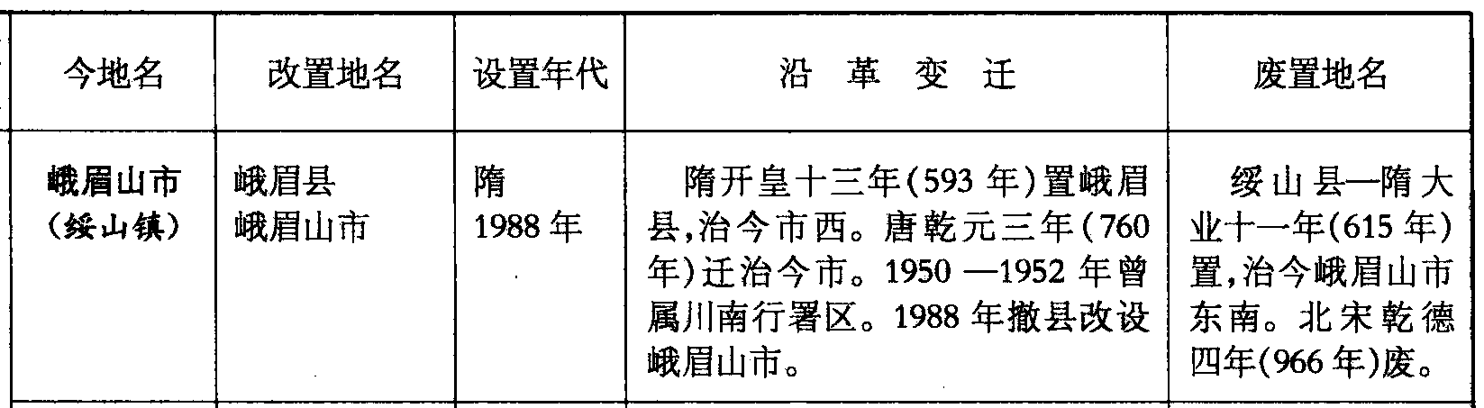 峨眉山市(绥山镇)峨眉县峨眉山市隋1988年隋开皇十三年(593年)置峨眉县,治今市西。唐乾元三年(760年)迁治今市。1950—1952年曾属川南行署区。1988年撤县改设峨眉山市。绥山县—隋大业十一年(615年)置,治今峨眉山市东南。北宋乾德四年(966年)废。