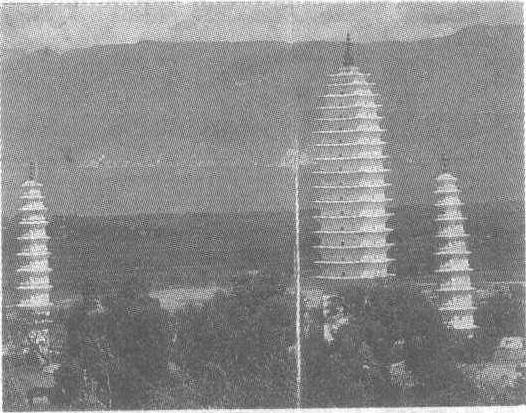 崇圣寺三塔 崇圣寺三塔中国古塔。位于云南省大理市洱海畔苍山之麓。三塔鼎足而立,大塔始建于唐开成后(约8世纪),名千寻塔,两小塔建于10世纪。三塔本来建在号称百厦千佛的崇圣寺山门前,因地震与兵火,寺宇已毁,唯三塔安然兀立,可见当时建塔技术的科学合理性。大塔建在二层台基上,在第一层高大的塔身之上施密檐16层,内部为空筒16层,总高69.13 m,台上塔身每面宽9.85 m,第1层高13.5 m,以上各层塔身低矮。主塔之西70 m处的南北塔各高42.19 m,共10层密檐式八角形砖塔。相距97.5 m,塔身实心砖砌,外壁白色粉刷,各层分别雕有券龛、佛像等,两塔顶各有3只铜葫芦。1978年重修,清理出南诏大理时期文物600余件。全国重点文物保护单位。 崇圣寺三塔 崇圣寺三塔位于云南省大理市苍山应乐峰下。崇圣寺早已不存,唯三塔屹立。三塔呈鼎足之势,均为砖砌。其中主塔为千寻塔,高约70米,为16级密檐式方塔。形制与西安小雁塔相似,每层四面有龛,置白色大理石佛像一尊。塔顶卷刹圆和。塔的西面设门,内装有木骨架,循梯而上可直达塔顶。整个塔的外形弧线轮廓优美,16层塔檐更为古塔中罕见之例。关于此塔的建筑年代众说纷纭,但多数认为建于八世纪,即云南南诏国后期,唐朝中期。南北两小塔为八角形10级密檐砖塔,均高42米,每级设平座,每角有倚栏,有些层还设有斗拱。塔身有佛像、莲花、花瓶等浮雕,华贵而庄重。顶端为鎏金塔刹。两塔建于十世纪,即云南大理国时期,宋代初期。1979年维修主塔时发现了南诏、大理国的重要文物,如佛像、菩萨、写经、印章、瓷器等680余件。三塔造型美观,布局和谐,以苍山为背景,洱海为镜面,天气晴朗之日,蓝天白云之下,美丽无比,成为国内享有盛誉的塔群,被列为全国重点文物保护单位。