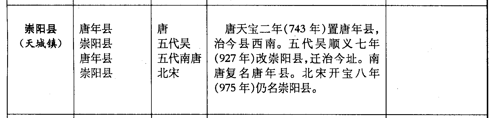 崇阳县(天城镇)唐年县崇阳县唐年县崇阳县唐五代吴五代南唐北宋唐天宝二年(743年)置唐年县,治今县西南。五代吴顺义七年(927年)改崇阳县,迁治今址。南唐复名唐年县。北宋开宝八年(975年)仍名崇阳县。