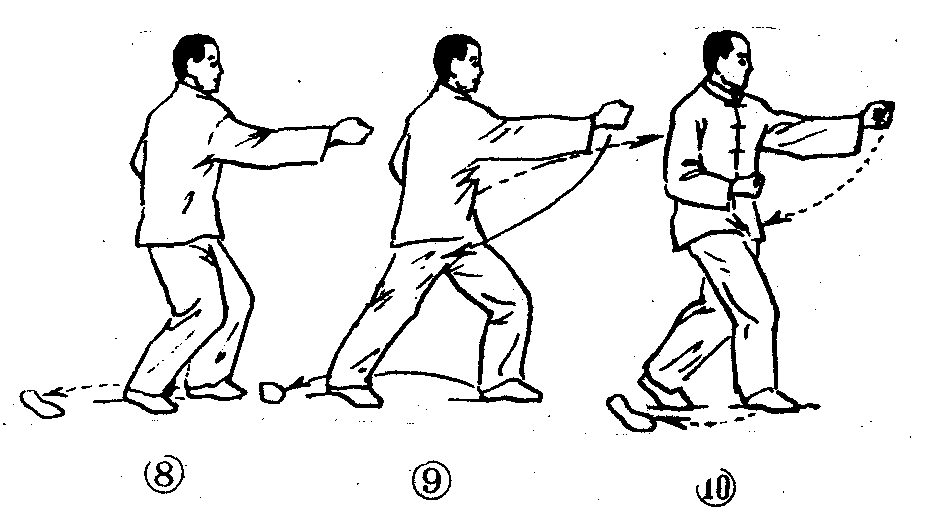 ❿)。然后右脚回撤与左脚并拢,同时左拳屈肘回收至腹前,双拳变掌自然下垂于身体两侧,同时身体轻缓站起。注意事项:老年初学者练习崩拳要特别注意“手脚齐到”,但前脚落地的力量不要过重。