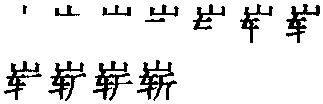 【提示】车,末笔是竖; 位于字或部件的左边时,横改提,且末笔是提。 *崭(嶄)〔嶃〕zhǎn11画 山部 (1) 〈书〉 高峻;突出: ~然|~露头角。 (2) 极;非常: ~新。 崭嶄嶃zhǎn小篆作。用于礹,汉代作崭巖(岩的异体字),指山石高峻状。崭从山,斩声。单用也是高、高峻、高出义。如:崭然(如:崭然露头角)|崭新(指簇新)。约唐宋时也作嶃。现作异体字。见《异体字表》。 崭嶄★繁◎常★常zhǎn嶄,形声,从山,斬声,本义为山高峻的样子,引申为副词(表示程度深,相当于“很”“非常”)。《简化字表》类推简作“崭”。 【辨析】 “崭新”也作“斩新”,现在的推荐写法是前者。 |