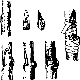 | 释义 | 嵌芽接chip budding一种带木质部的芽接方法。在选定接芽的上方约1 cm处向下削,长约1.5 cm,稍带木质部,再在芽下方0.5~0.8 cm处斜切呈30°夹角达第一刀底部,取下芽片。砧木切口比芽片略长,稍切及木质部,呈倒舌状。插入芽片后,上端须露出一线砧木皮部,然后扎缚。本法在皮部不易剥开时应用。适用于枝条稍有棱角或沟纹的树种,如栗、枣、苹果和柑橘等。