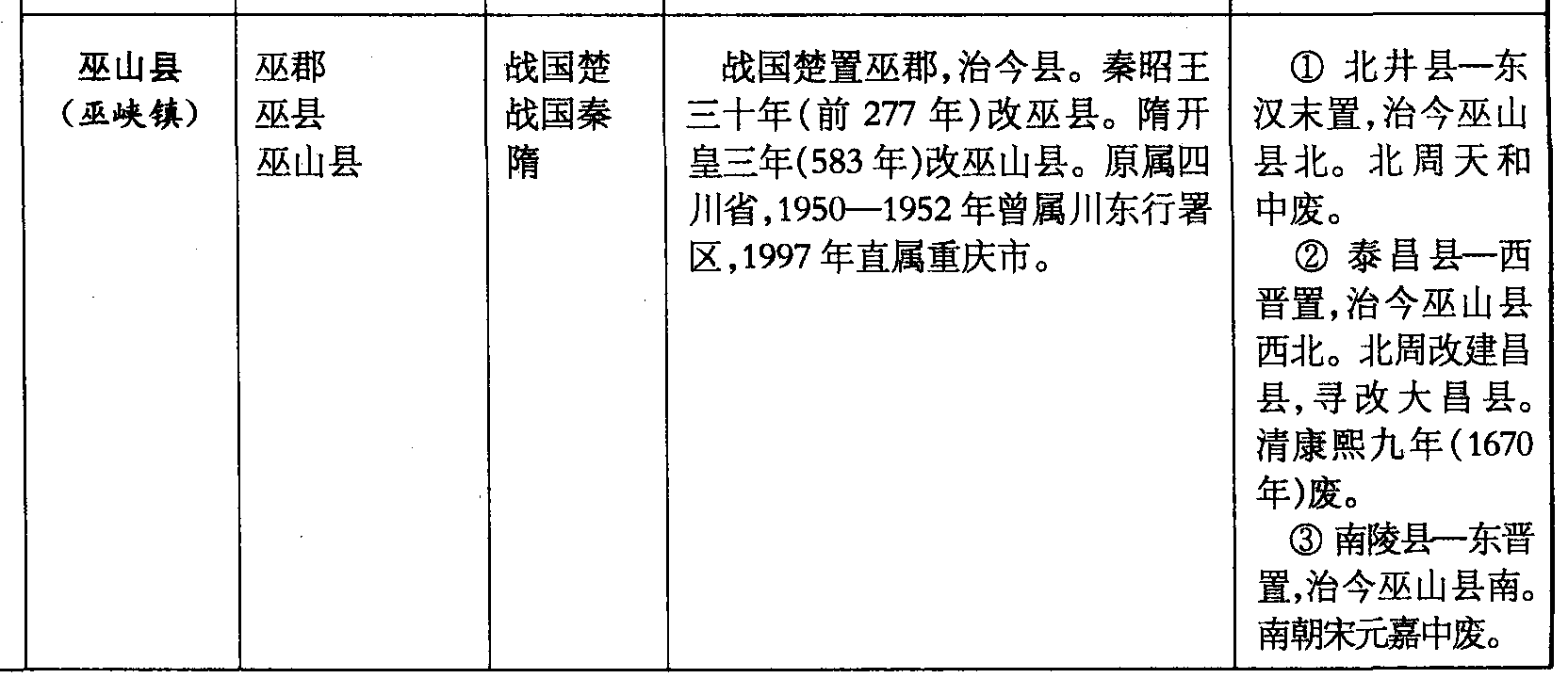 巫山县(巫峡镇)巫郡巫县巫山县战国楚战国秦隋战国楚置巫郡,治今县。秦昭王三十年(前277年)改巫县。隋开皇三年(583年)改巫山县。原属四川省,1950—1952年曾属川东行署区,1997年直属重庆市。❶ 北井县—东汉末置,治今巫山县北。北周天和中废。❷ 泰昌县—西晋置,治今巫山县西北。北周改建昌县,寻改大昌县。清康熙九年(1670年)废。❸南陵县—东晋置,治今巫山县南。南朝宋元嘉中废。