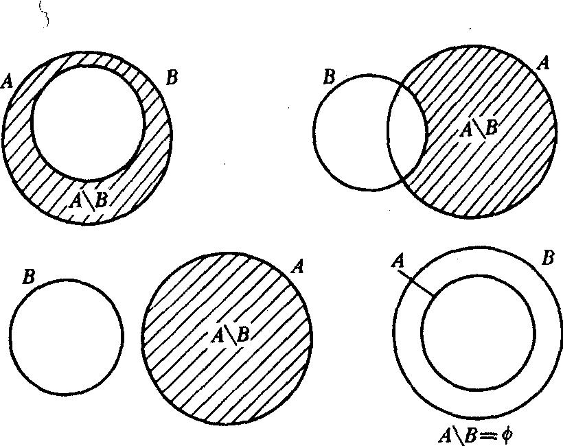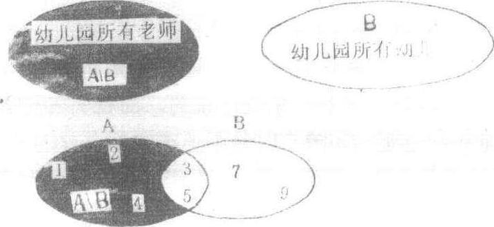 对于两个集合A和B,由所有只属于A不属于B的元素所组成的集合,称为A与B的差集,记作A\\B。例如:A={1,2,3,4,5},B={3,5,7,9},则A\\B={1,2,4};又如:A={幼儿园的所有老师},B={幼儿园的所有幼儿},则A\\B={幼儿园的所有老师}。用韦恩图分别表示如下: