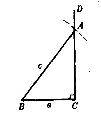 作法 ❶作线段BC=a; ❷作DC⊥BC; ❸以B为圆心,c为半径作弧,交CD于A; ❹连结AB.则△ABC就是所求的三角形. 讨论 当c≤a时,本题无解. ☚ 已知三边作三角形 作三条已知线段的第四比例项 ☛ |