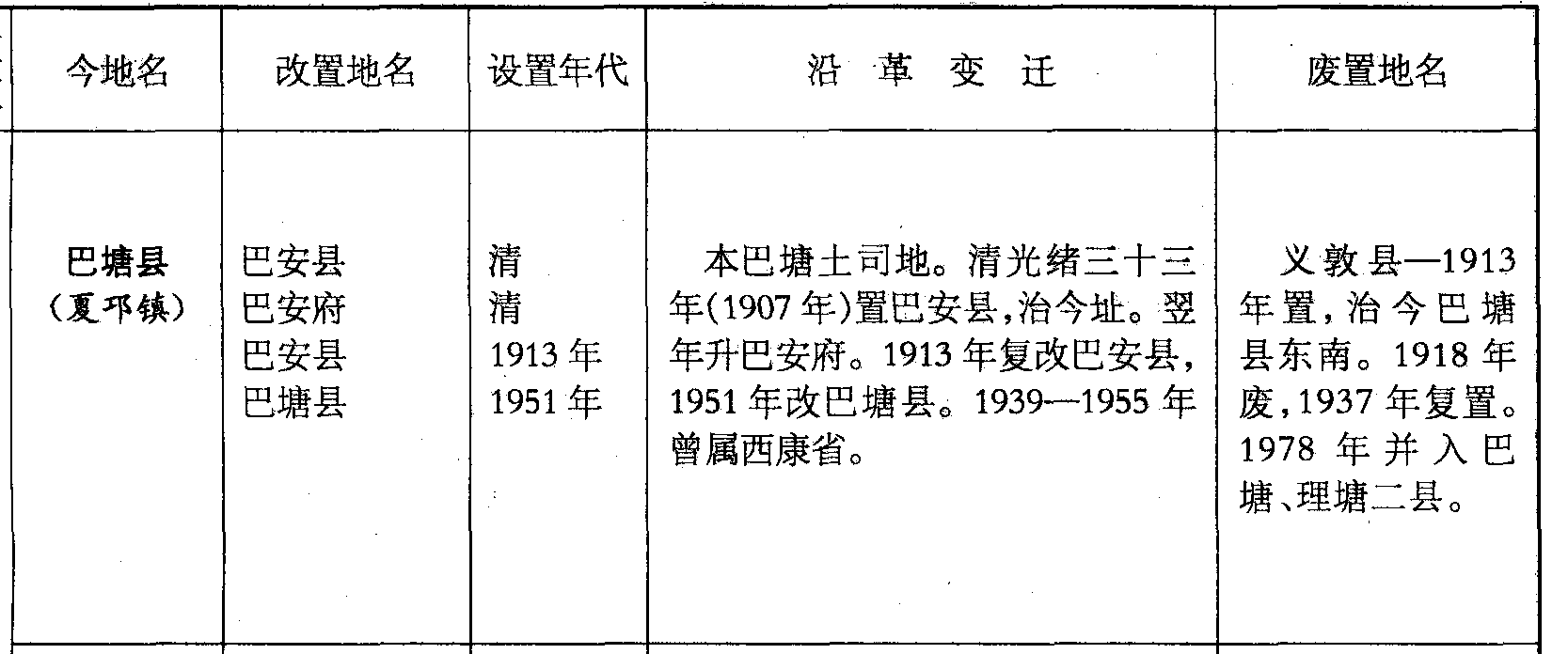 巴塘县(夏邛镇)巴安县巴安府巴安县巴塘县清清1913年1951年本巴塘土司地。清光绪三十三年(1907年)置巴安县,治今址。翌年升巴安府。1913年复改巴安县,1951年改巴塘县。1939—1955年曾属西康省。义敦县—1913年置,治今巴塘县东南。1918年废,1937年复置。1978年并入巴塘、理塘二县。