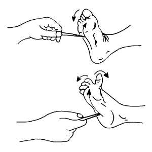 用竹签由足跟开始沿足底外侧向前轻划,至小趾跟部再转向𧿹趾侧。正常时可引起𧿹趾及其他四趾跖屈,称正常跖反射;如出现𧿹趾背伸,其余四趾呈扇形展开,则称巴宾斯基征阳性。一岁半以前的小儿因锥体束发育不完善,双侧可出现此征,不应作为病理现象对待。