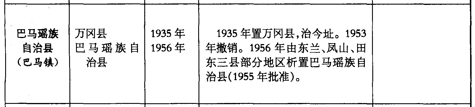 巴马瑶族自治县(巴马镇)万冈县巴马瑶族自治县1935年1956年1935年置万冈县,治今址。1953年撤销。1956年由东兰、凤山、田东三县部分地区析置巴马瑶族自治县(1955年批准)。