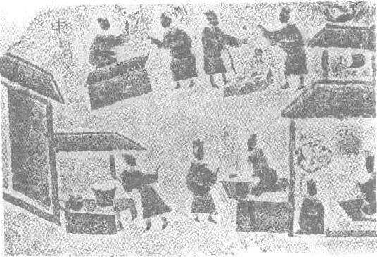 | 释义 | 古代名物 > 雕繪類 > 雕塑部 > 陵墓雕塑 > 市井畫像磚 市井畫像磚 shìjǐnghuàxiàngzhuān 東漢畫像磚。四川成都新繁出土,公元1965年縣文化館徵集。高四○·五厘米,長四七·五厘米。市井正方形,三方開門,上方與左方門内分書“北市門”、“東市門”。市内設市肆、市隧、市廛(供商人存儲貨物之房舍)、市樓。市井爲一寬敞市隧,整齊分爲四個列肆,每肆各居一隅,設三、四列商店;市隧人行道上,商人滿街叫賣,或坐或立,或互相交談,送貨獨輪車亦穿行其中;市樓位於十字形街道中心,爲管理市井之官署所在地。市樓之上置鼓,擊鼓以令市。磚刻以簡潔綫條,平列手法,刻畫了漢代都市内市場布局、主要建築與場内交易情况。此類畫像磚於四川廣漢、彭縣亦各見一幅,以新繁所出最爲典型。現藏四川省博物館。 市井画像砖 市井画像砖东汉。长27厘米,宽48.4厘米。传四川省广汉县周村出土。北京中国历史博物馆藏。砖面表现了市井的部分场面:右侧门垣旁,标有隶书题记“东市门”三字,由此向左分别有数人或列肆坐售,或支釜叫买,或摆摊兜揽忙碌着。再向左为一四阿顶的双层楼,楼顶栖息一只朱雀,楼上悬鼓,楼下有两人相对而坐,是管理市井的官吏,其头顶标有隶书题记“市偻(楼)”二字。战国到西汉市府所在地设置“市楼”,管理市井。开市时升起一旗,下市时降旗。此楼只见鼓而不见旗,当属地方差异。