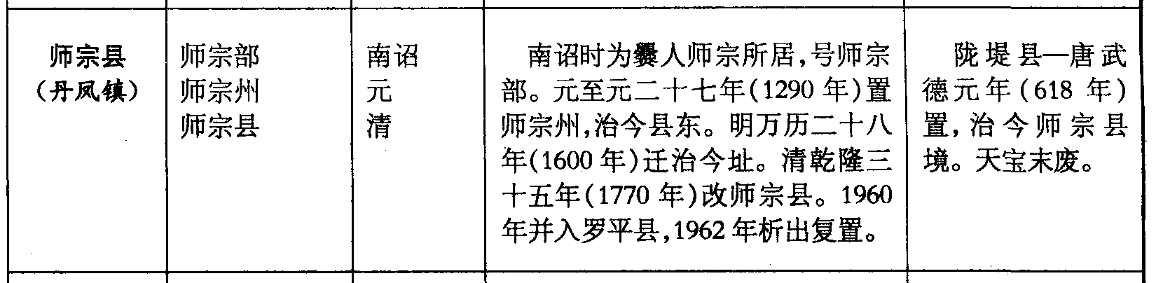 师宗县(丹凤镇)师宗部师宗州师宗县南诏元清南诏时为爨人师宗所居,号师宗部。元至元二十七年(1290年)置师宗州,治今县东。明万历二十八年(1600年)迁治今址。清乾隆三十五年(1770年)改师宗县。1960年并入罗平县,1962年析出复置。陇堤县—唐武德元年(618年)置,治今师宗县境。天宝末废。