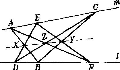 | 释义 | 帕普斯定理 帕普斯定理papusidingli若在直线m和l上各有三个点A,E,C和D,B,F(如图).则六边形ABCDEF的三双对边AB与DE,BC与EF,CD与FA的三个交点X,Y,Z共线.