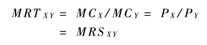 | 释义 | 帕累托最优的交换和生产条件福利经济学中同时满足消费品和生产要素的帕累托最优配置的条件。在消费品和生产要素的配置中,如果生产要素最优配置下的产品组合与消费者的购买意愿相一致,这种配置被称为“消费品和生产要素的帕累托最优配置”;同时满足消费品和生产要素的帕累托最优配置的条件被称为“帕累托最优的交换和生产条件”。该条件是,生产者的边际转换率与消费者的边际替代率相等。这一条件表现在图形上,就是生产者的生产可能性曲线与消费者的等效用曲线的相切点。生产可能性曲线上的点的斜率的绝对值为边际转换率,等效用曲线上的点的斜率的绝对值为边际替代率。在切点上,两条曲线的斜率相等,因此边际转换率与边际替代率相等。图中,以横轴表示鱼的产量(以X为代表),纵轴表示黄瓜的产量(以Y为代表),黑实线是生产者的生产可能性曲线,虚线是消费者的等效用曲线,两条曲线相切于A点。生产可能性曲线上的每一点都是在生产要素的帕累托最优配置下可以生产出来的鱼和黄瓜的不同数量的组合。但从消费者的角度看,这些点的产品组合并不都是与他们的购买意愿相符合的。比如,假定边际转换率为1,边际替代率为2,边际替代率大于边际转换率。在边际替代率为2时,消费者想放弃2单位黄瓜来得到1单位鱼。由于边际转换率为1,多生产1单位鱼的成本只是少生产1单位黄瓜的损失。这样,就要多生产鱼,使边际替代率下降而边际转换率提高,直到二者相等。在切点A,生产者想要生产与出售的鱼和黄瓜的数量与消费者想要购买的数量相同,消费者和生产者同时实现最优配置。结果,在完全竞争市场中,两种商品的边际转换率等于这两种商品的边际成本之比,等于这两种商品的价格之比,等于这两种商品的边际替代率。以MCX代表鱼的边际成本,MCY代表黄瓜的边际成本,PX代表鱼的价格,PY代表黄瓜的价格,MRTXY代表鱼对黄瓜的边际转换率,MRSXY代表鱼对黄瓜的边际替代率,则上述条件可以写为: