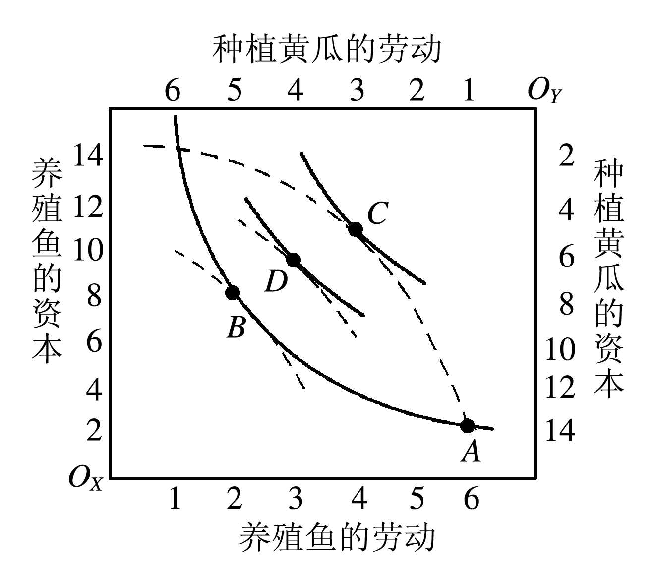 | 释义 | 帕累托最优的生产条件福利经济学中满足生产要素的帕累托最优配置的条件。在生产要素配置中,如果在不减少一些产品产量的情况下,可以增加另一些产品的产量,那么这种配置是可以进一步改进的,因此被视为无效率配置;如果不减少一些产品的产量,就不能增加另一些产品的产量,这种配置被称为“生产要素的帕累托最优配置”。满足生产要素的帕累托最优配置的条件被称为“帕累托最优的生产条件”。这一条件是在既定的生产要素下,对任何两种产品来说,任何两种投入要素的边际技术替代率都相等。这时,生产者的利润达到最大化。这一条件表现在等产量曲线图上,就是两种产品的等产量曲线的相切点。等产量曲线上的点的斜率的绝对值是两种投入要素的边际技术替代率。在切点上,两条等产量曲线的斜率相等,因此其边际技术替代率相等。以两种产品(鱼和黄瓜)之间配置两种投入要素(劳动和资本)为例。图1是盒形图,其横向长度为全部可供配置的劳动的数量,纵向为全部可供配置的资本的数量。图中下面的横轴表示养殖鱼所投入的劳动量,左边纵轴表示养殖鱼所投入的资本量,以左下角的OX为原点。图中的实线曲线(如AB曲线)为鱼的等产量曲线。上面的横轴表示种植黄瓜所投入的劳动量,右边纵轴表示种植黄瓜所投入的资本量,以右上角的OY为原点。图中的虚线曲线(如AC曲线)为黄瓜的等产量曲线。黄瓜的等产量曲线是鱼的等产量曲线旋转了180度。以两条等产量曲线的交点(A点)作为生产要素的初始配置点。这时,养殖一定量的鱼需要投入6单位劳动和2单位资本,种植一定量的黄瓜需要投入1单位劳动和14单位资本。两种产品的生产总共有7单位劳动、16单位资本。这是全部可配置的资源,现重新配置。在A点,对于养殖鱼来说,减少1单位劳动需要增加0.5单位资本,在这点上养殖鱼的劳动多、资本少,所以资本的生产率较高。这样,在A点,养殖鱼的劳动对资本的边际技术替代率为0.5。此时,对于种植黄瓜来说,为增加1单位劳动,可以减少6单位资本,在这点上种植黄瓜的劳动少、资本多,所以资本的生产率较低。这样,在A点,种植黄瓜的劳动对资本的边际技术替代率为6。重新配置的可能结果是,养殖鱼用1单位劳动可以换到0.5单位至6单位资本。假定从种植黄瓜中抽出6单位资本换回1单位劳动,而从养殖鱼中抽出1单位劳动换回0.5单位资本,这样就有5.5单位资本没有进入最终配置,也就是全部可供配置的资源没有被充分利用。这说明,在原有资源条件下,通过重新配置,还可以进一步提高产量。只要两种要素的边际技术替代率不同,即只要两条等产量曲线相交,就有进一步互利配置的余地,而交点(比如A点)的配置则是无效率配置。只有在两条等产量曲线所围成的区域内,使两条曲线相切的点(如图1中D点),包括在等产量曲线上相切的点(图1中的B点和C点),才是帕累托最优配置点。在D点,养鱼者从4单位劳动减到3单位劳动时,他换回2单位资本,劳动对资本的边际技术替代率为2;与此同时,种黄瓜者从3单位劳动增加到4单位劳动时,他用了2单位资本去换劳动,劳动对资本的边际技术替代率也为2。此时,养鱼者拥有3单位劳动、10单位资本,种黄瓜者拥有4单位劳动、6单位资本,全部可供配置的资源均得到有效安排。在D点,在不减少一种产品产量的情况下,就不存在使另一种产品继续增加产量的可能。