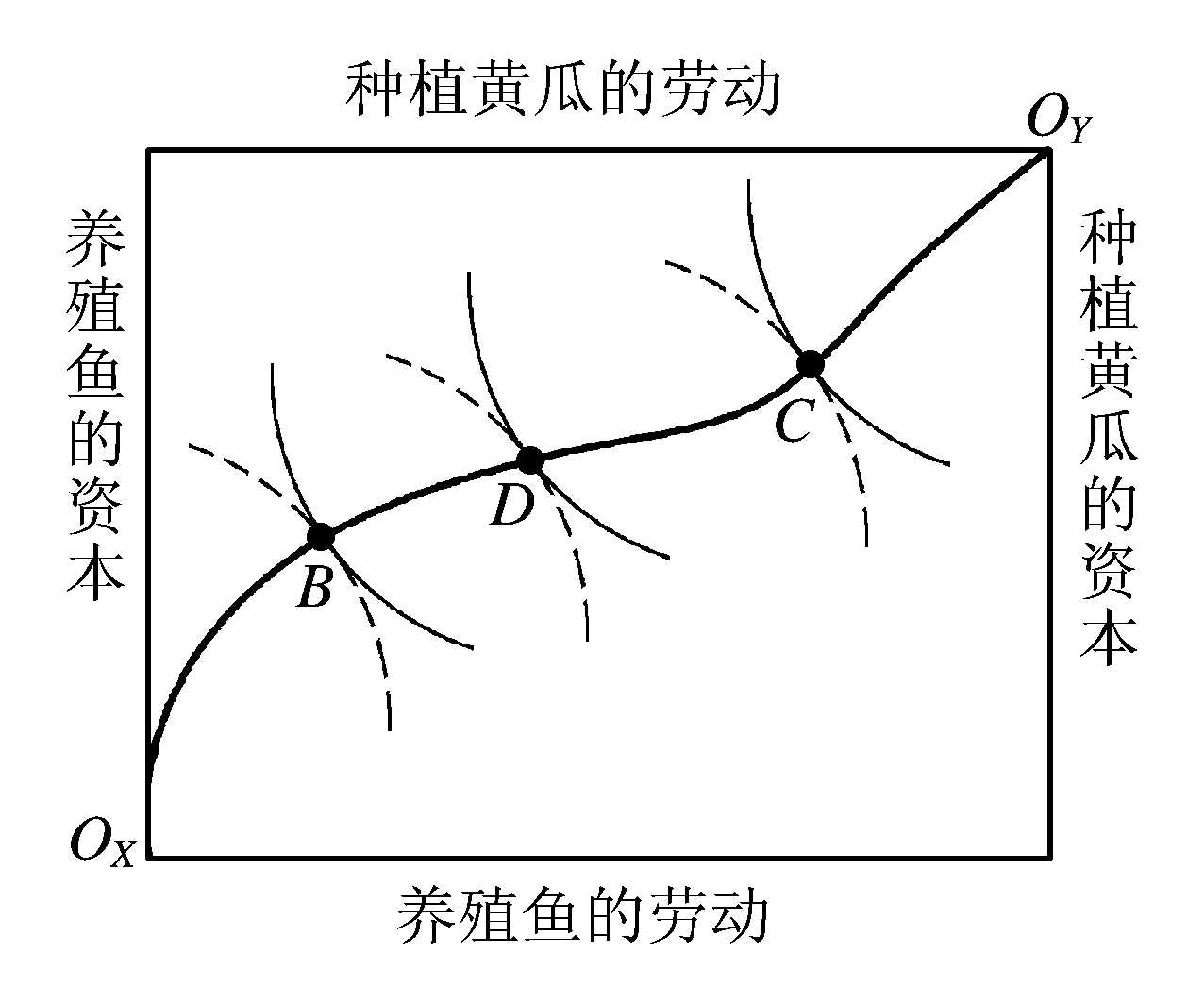 图1 将生产要素的所有可能的帕累托最优配置点连接起来的曲线,称为“生产契约曲线”,即图2中连接各切点B、D、C的曲线。