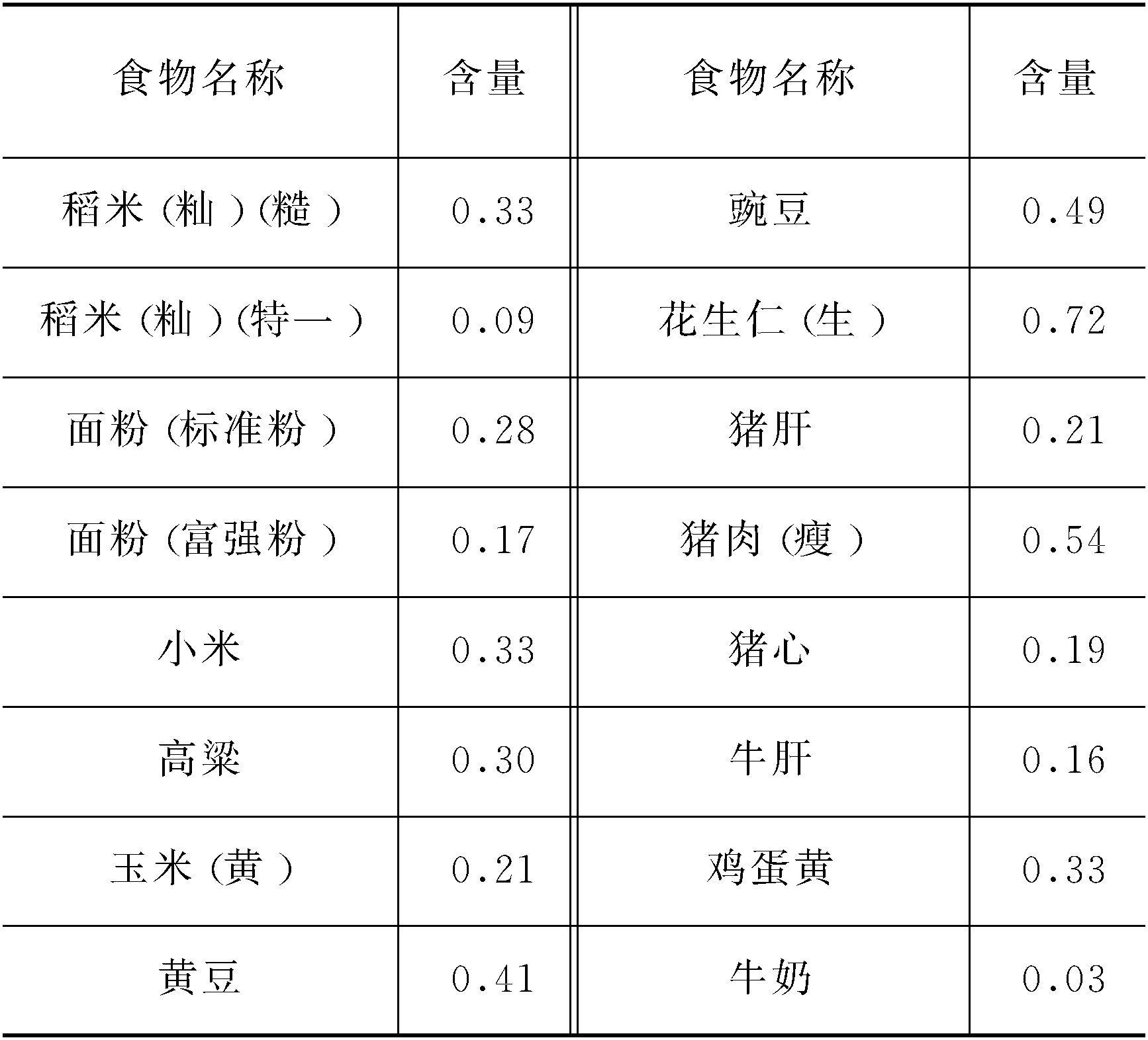 中国营养学会1988年建议维生素B1供给量成年人每日1.2~1.5 mg。常见食物中维生素B1含量如下(以100g计,单位:mg):