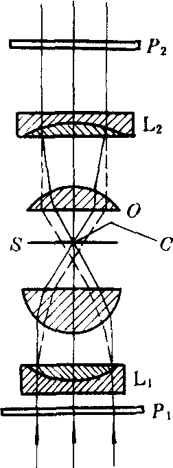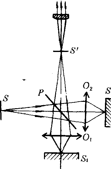 | 释义 | 干涉显微镜interference microscope根据光的衍射和干涉原理。使被检样品细节的光程差(或相位差)转化为明暗及色泽差别的显微镜。采用较多的干涉系统是照明光经起偏振器成偏振光,通过方解石将每一光束分成两束光,一束通过载玻片上的样品,另一束沿同样的光路,但不通过样品,再经一方解石将两束光合成一束光,最后用一偏振器将合成光转换到相同的偏振方向而产生干涉。其优点是能消除相差显微镜观察时常见的细节光晕,同时细节间不仅有明暗对比而且还具有色泽对比,并有一定的立体感。从单色光在透过标本后光程的延缓可以测定细节的干重(如蛋白质重量)、标本的厚度和标本的含水量,是细胞化学定量测定的方法之一。 干涉显微镜 干涉显微镜ganshe xiangweijing干涉仪和显微镜组合而成的一种测量仪器。可通过对双光束干涉条纹的观察和测定,对某些量进行精密的测量。按参加干涉的光束是经被测样品反射或透射的不同,可分为反射式和透射式两种类型。反射式干涉显微镜由迈克耳孙干涉仪发展而来,其光路原理如图1所示。由光源S发出的光束,经分光板P分为反射和透射两束光,其中反射光束射向被测样品表面S1,透射光束射向参考表面S2。由S1反射的光束通过物镜O1又透过P,在O1的焦平面S′上形成S1的像。由S2反射的光束通过与O1相同的物镜O2后又经P反射,在S′上也形成S2的像。构成两个像的二光束,在像的对应点上是相干的,可通过目镜观察干涉条纹的情况。透射式干涉显微镜有不同的实现方案,图2示出了一种称为双焦干涉显微镜的透射式干涉显微镜的光路原理。入射光经起偏器P1和双折射透镜L1分为不同会聚程度的两束光(分别用实线和虚线表示)。其中一束光通过被测样品S的一点C,另一束通过样品上以C为中心的一个圆形区域,其中每条光线受样品某些不均匀性的影响而产生不同的位相变化。这两束光再经物镜O、双折射透镜L2和检偏镜P2以后,在目镜焦平面上会合生成干涉图样,通过目镜进行观察。干涉显微镜是一种精密的测量仪器,在良好的条件下可测出λ/1300的光程差,因而广泛用于测量表面的粗糙度、表面刻痕的深度、表面镀膜的厚度、透明物体折射率的不均匀性、生物细胞的光学性质等。